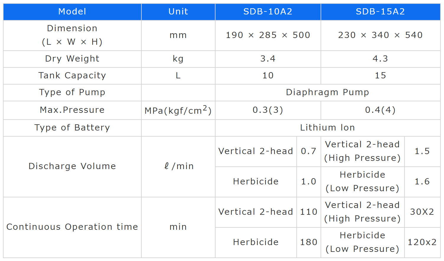Specifications knapsack type motor-powered sprayers (lithium battery)featuresOur highly regarded motor powered knapsack sprayer also available with rapid recharge lithium battery. 30minutes for recharge.