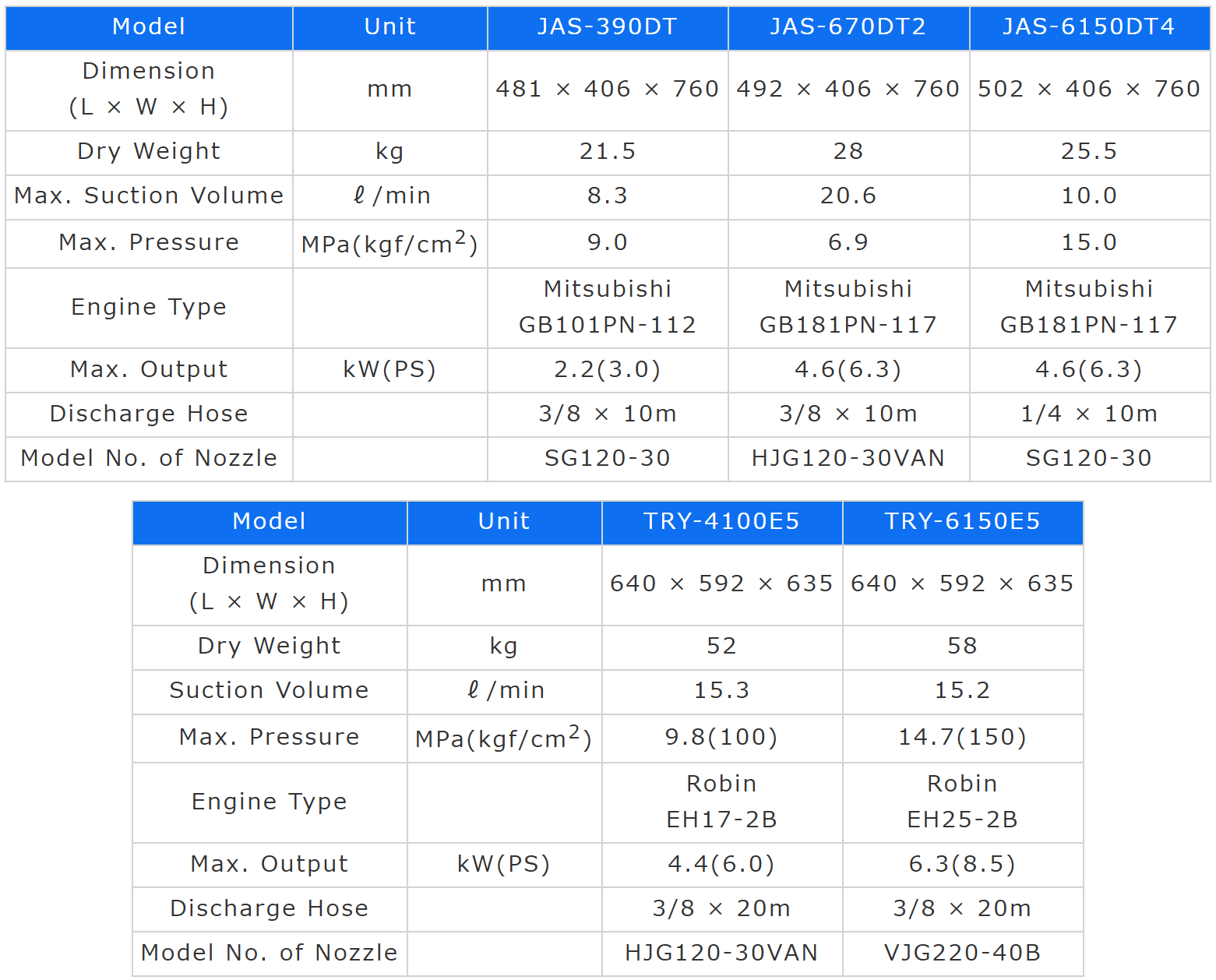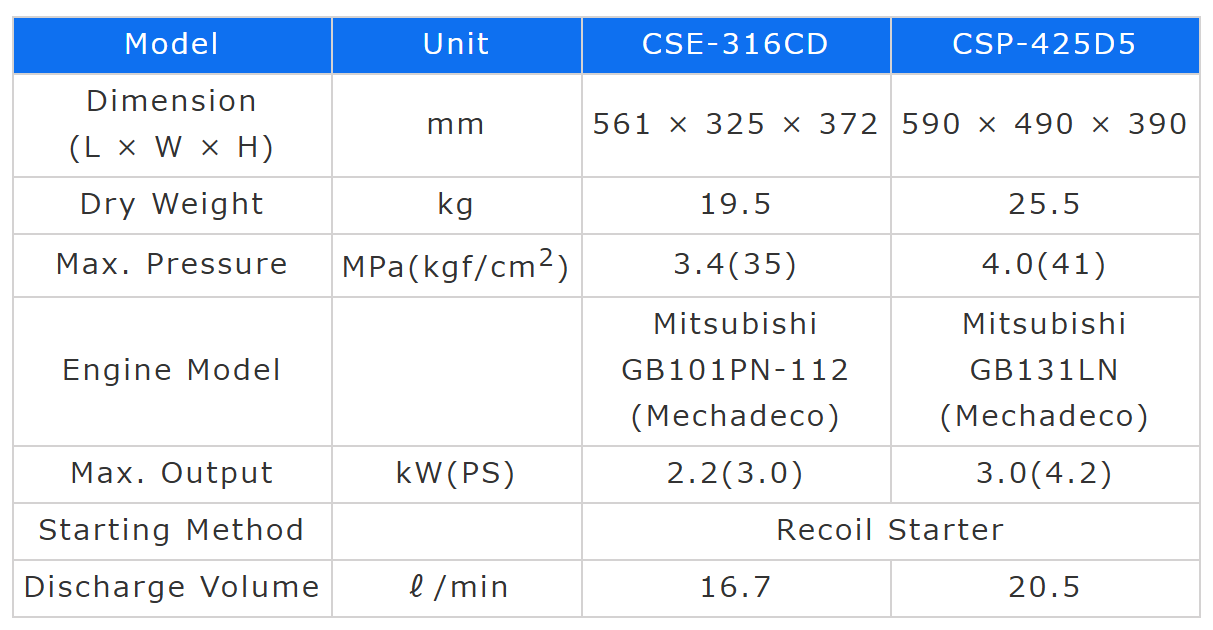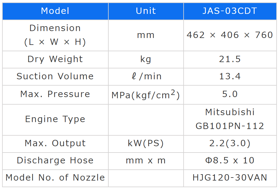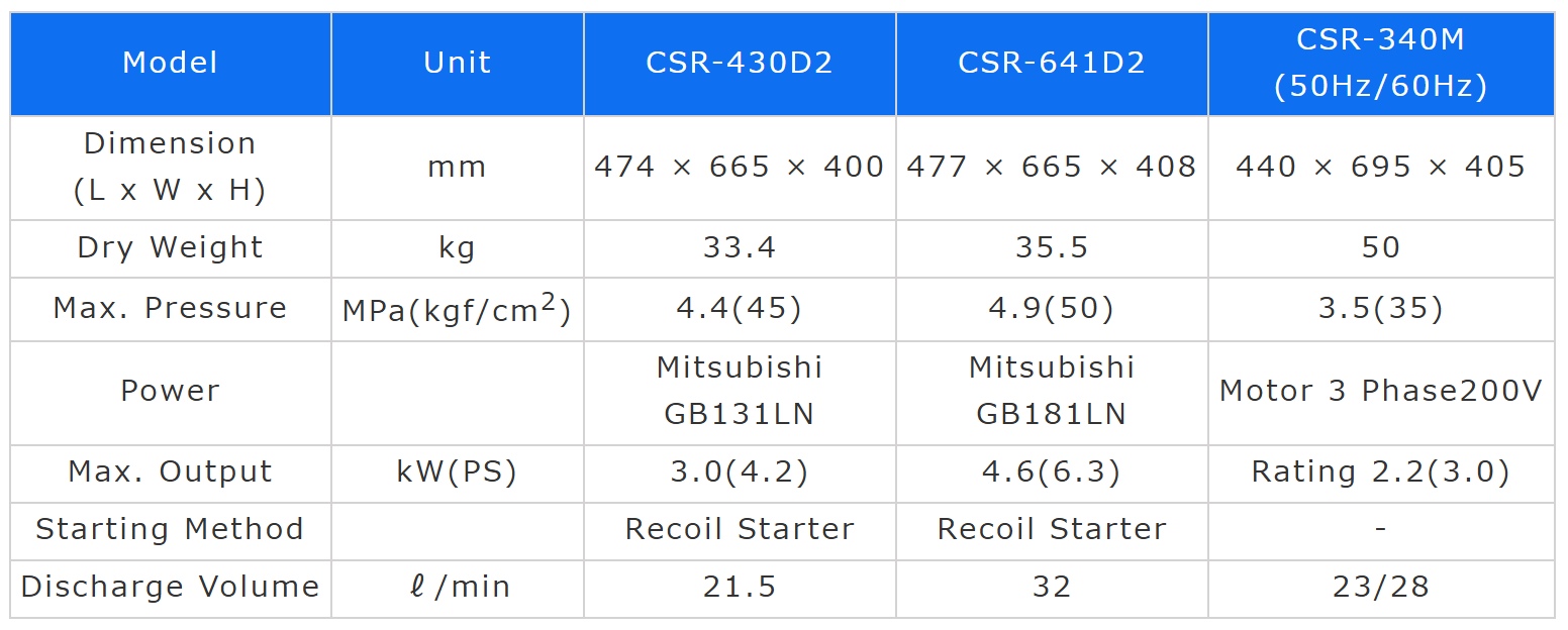 Specifications Pressure Washer (for bark peeling, unloader type)featuresThis pressure washer design is simple, compact, portable and powerful (100kgf/cm2-150kgf/cm2).