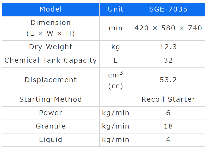 Specifications Power DusterfeaturesDispersion width of 10-25m making it possible to spray from edge of field quickly and uniformly.