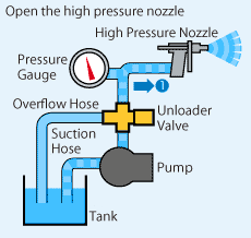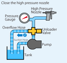 The function of unloader valve.Fix an unloader valve like the chart below and set it for constant pressure.When the high pressure nozzle is opened, it becomes the❶direction.when the high pressure nozzle is closed, the pressure rises. and when it becomes higher than fixed pressure, the unloader valve start working. The flow changes in the direction of ❷, and water/solution return to a tank through overflow hose.As for the pump, it runs under low pressure operation.
