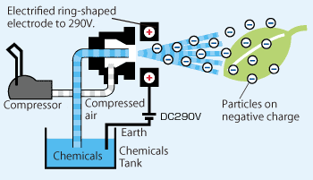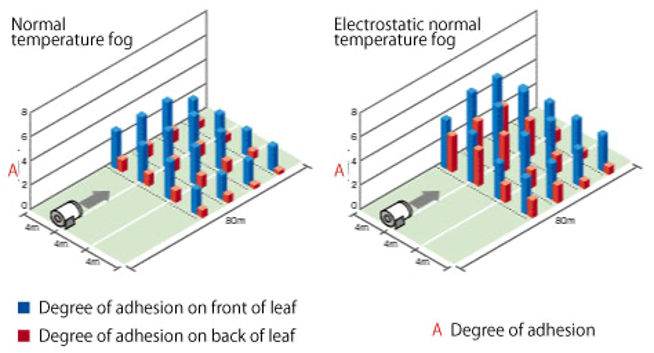 As this electrostatic spraying system is able to load the static electricity on the ultra fine particles of the conventional Arimitsu normal temperature fog machine LVH series and an adhesion rate to the back of leaves increases. Superior pest control effect is provided.