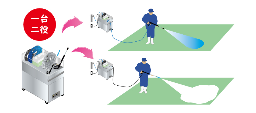 小型高圧洗浄・泡洗浄兼用機は、コンパクトながらも1台で高圧洗浄・泡洗浄を切替で使用可能。