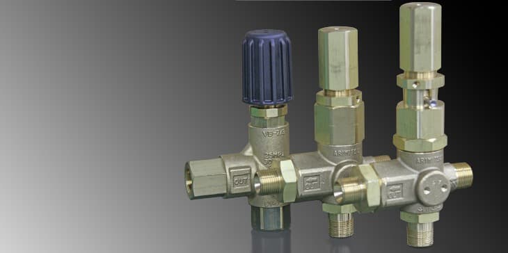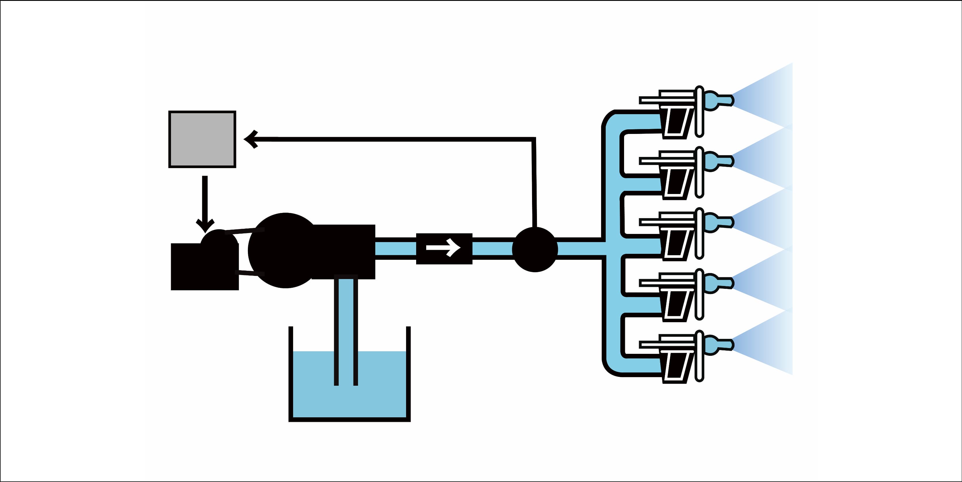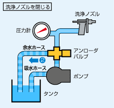アンローダバルブを下図の様に取付けて、一定の圧力に設定することにより、洗浄ノズル開放の場合❶方向となります。洗浄ノズルが閉じられた場合、圧力が上昇し、設定圧力以上になると、アンローダバルブが働き、流れは❷の方向に変わり、余水ホースからタンクへ還流され、ポンプは低圧運転されます。