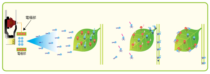 ②ノズルから噴霧される霧が、電極部を通過する際にマイナスに帯電し噴霧します。