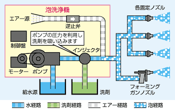 高圧の水で洗剤と空気を吸い込み泡を作ります。