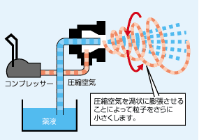 超微粒子を発生させるために、圧縮空気を渦状に音速で膨張させることによって粒子を小さく(ノズル噴霧口付近で12μm以下、落下粒子径で2~5μm)する構造になっています。
