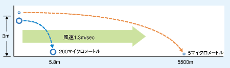 風速1.3m/秒,3mの高度から地上に 落下するまでに飛散する距離 |